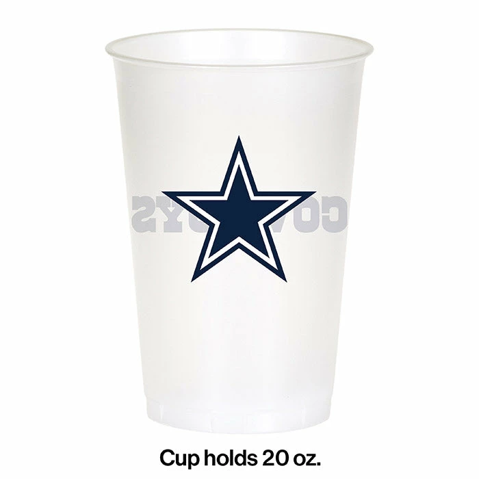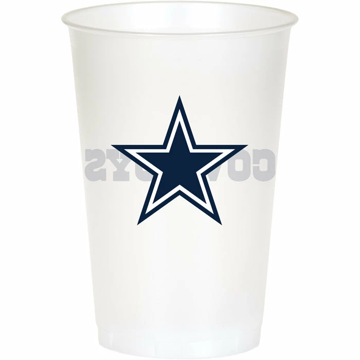Details: When serving beverages to thirsty patrons use officially licensed NFL tableware for die-hard football fans. Our Dallas Cowboys Plastic Cups are constructed from #6 recyclable plastic and feature the team’s star logo and a “Cowboys” headline in blue. Cups hold up to 20 ounces and can be used for cold drinks including soda iced tea and beer. Safe for use at indoor and outdoor venues the plastic cups are sold in retail-ready packaging of 8 each. Approximate Size: 20 oz. Material: #6 Recyclable Plastic