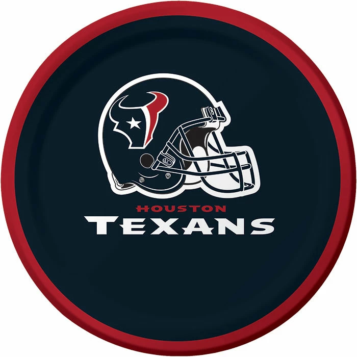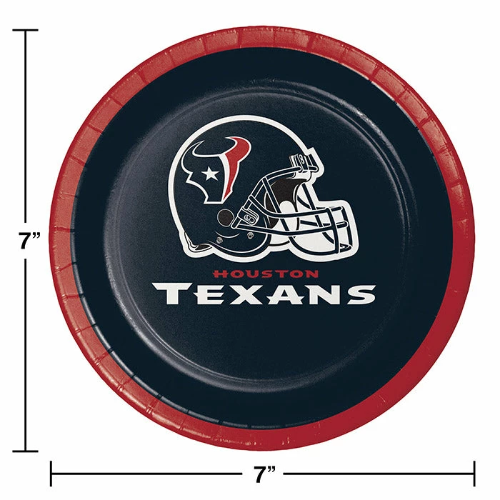 Details: Help fans host all of their football fanatic friends effortlessly with our Houston Texans Dessert Plates and coordinating disposable tableware. Made for rapid cleanup these disposable plates feature red and blue colors making them match our selection of Houston Texans party supplies. Take your party aisle to the next level with our NFL party plates. Approximate Size: 6.875″. Material: Heavyweight Paperboard