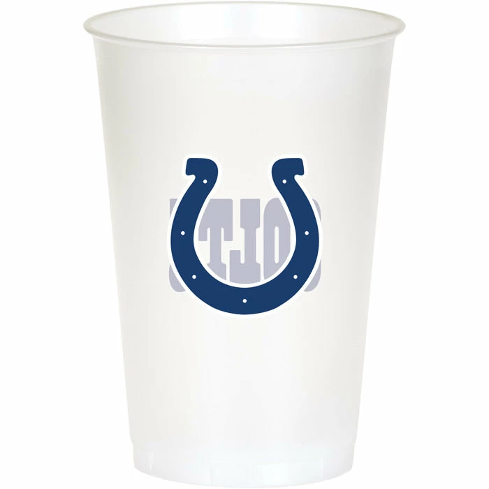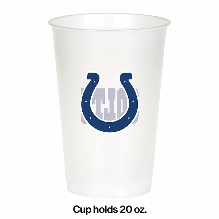 Details: Drink in the game day fun with officially licensed NFL tableware! The Indianapolis Colts 20 oz Plastic Cups feature a blue horseshoe and blue Colts logo on either side of the clear cup. These are the perfect accessory to show plenty of team spirit! Generously sized the cups are ideal for any game day beverage. Retailers groceries and event planners will please Indy fans by providing these festive plastic cups. Pair with coordinating solid color tableware or match with the rest of the Colts ensemble for a game day look that is full of team spirit! Plastic cups are sold 8 per package. Approximate Size: 20 oz. Material: #6 Recyclable Plastic