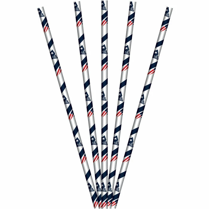 Details: Score extra points with these officially licensed party accessories! New England Patriots Paper Straws are sure to make the perfect addition to any beverage station or food display at tailgating events and game day gathering spots. The straw is printed on biodegradable 100% chlorine free white paper with a blue spiral stripe and repeating patriot head logo in between. This little accent is just the thing to ensure patron’s get the ultimate fan experience. Straws measure 7.75″ long and are packaged in quantities of 24. Approximate Size: 7.75″. Material: Biodegradable 100% Chlorine Free Paper