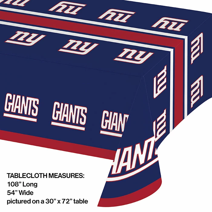 Details: Provide the perfect topping for football celebrations with NFL licensed tableware items. The New York Giants table covers are the perfect accessory to light up the background for other team products and festive food and drinks. The sturdy table covers are constructed of medium weight plastic and features an all-over royal blue background printed with a bold red stripe down the center bordered by narrower blue and white stripes. Each long drop edge has a red border and the team logo “ny” and name “Giants” is printed repeatedly across the cover each outlined in red. Energize fans at restaurants concession food seating tailgate events and game day gatherings with convenient disposable plastic covers that are easy to wipe clean and even easier to clean up or simply throw away! Event planners and retailers will score extra points when these decorative table covers are sold alongside other items from the Giants ensemble or with coordinating solid color accessories. table covers measure 54 inches by 102 inches and are sold individually wrapped. Approximate Size: 54″ x 102″. Material: Mediumweight Plastic