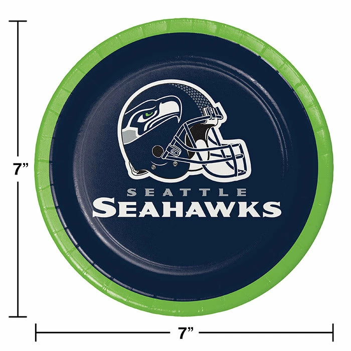 Details: Serve game day patrons appetizers finger foods and desserts atop officially licensed NFL tableware. Hawks fans will flock to your establishment to partake of goodies served atop our Seattle Seahawks Dessert Plates. The 6.875 inch plates are perfect for viewing parties team celebrations and super fan birthdays featuring the image of a team helmet accented by the fierce Seahawks logo. A bold deep blue background and action green border highlight the design which includes a “Seattle Seahawks” headline in grey and white block letters. Perfect for large fan gatherings the disposable plates provide easy set-up and take-down and are available in generous quantities. Each retail-ready package contains 8 plates. Approximate Size: 6.875″. Material: Heavyweight Paperboard