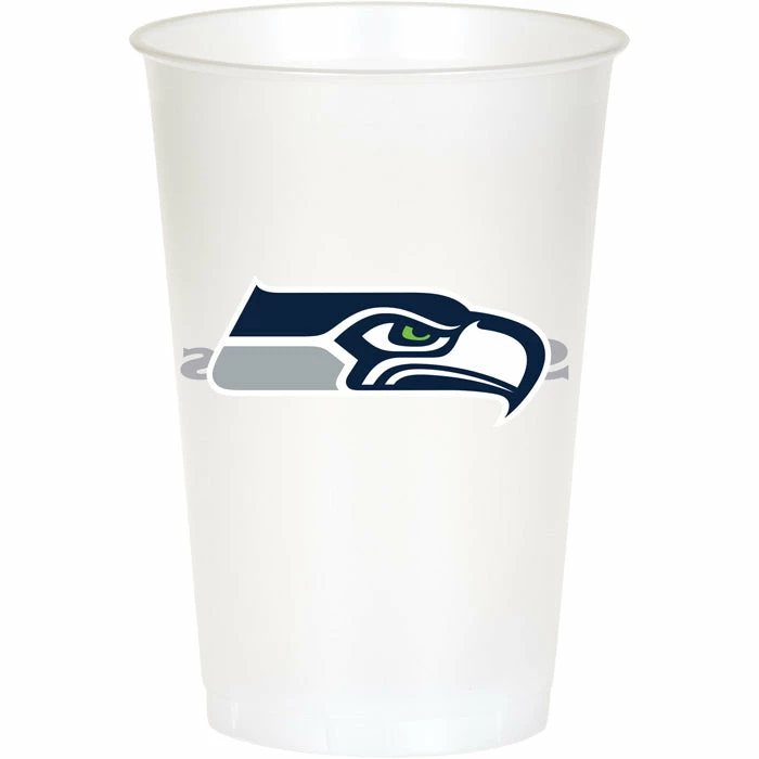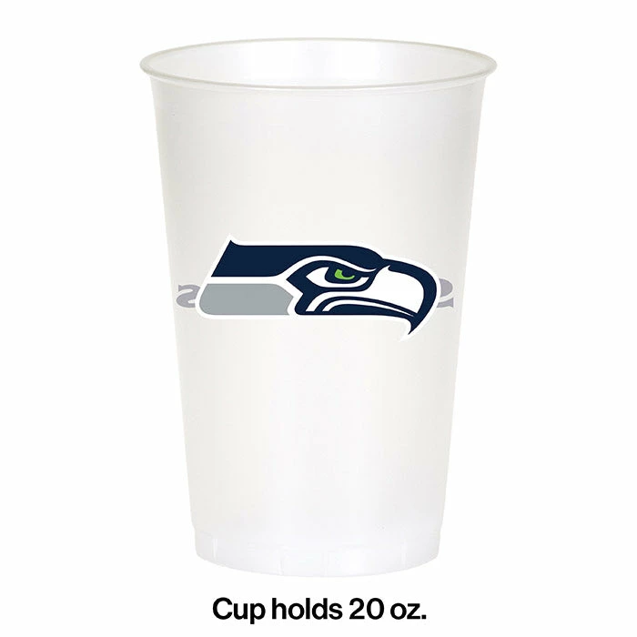 Details: Quench the thirst of super fans on game day with team inspired specialty drinks served in officially licensed NFL cups. Frosty beverages offered in these Seattle Seahawks 20 oz Plastic Cups will be a hot item at viewing parties and team celebrations. Featuring the fierce Seahawks logo accented by the team colors of college blue action green and wolf grey the durable plastic cups are great for indoor and outdoor occasions. The 12th man will be singing your praises when they are encouraged to head home with these spirited cups then bring them back to be refilled on another big game day. Seahawks plastic cups are packaged in retail-ready quantities of 8 each. Approximate Size: 20 oz. Material: #6 Recyclable Plastic