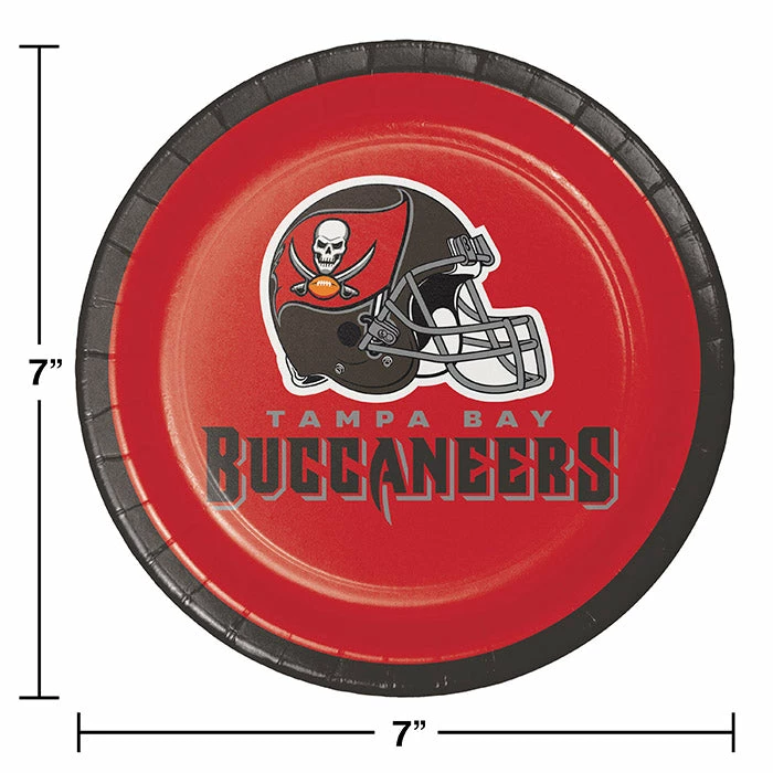 Details: Spruce up the party aisle with our selection of Tampa Bay Buccaneers Dessert Plates. Our dessert plates are sold in and feature the Tampa Bay logo atop a red background. Coordinating with the rest of the Buccaneers party supplies these dessert plates will add a touch of fandom to any football event. Take your Tampa Bay party offering to the next level with our NFL plates. Approximate Size: 6.875″. Material: Heavyweight Paperboard