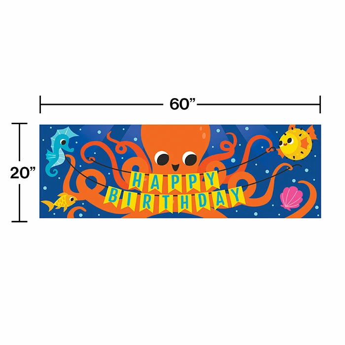 Details: Decorate your party in style with this Ocean Celebration Happy Birthday Banner. Featuring an adorable octopus holding up the phrase “Happy Birthday”, this banner is the perfect addition to your party. Measuring 20″ x 60″ this banner can be paired with any other Ocean Celebration party supplies. Our Ocean Celebration Happy Birthday Banners are perfect for event planners, caterers, and home hostesses alike.
