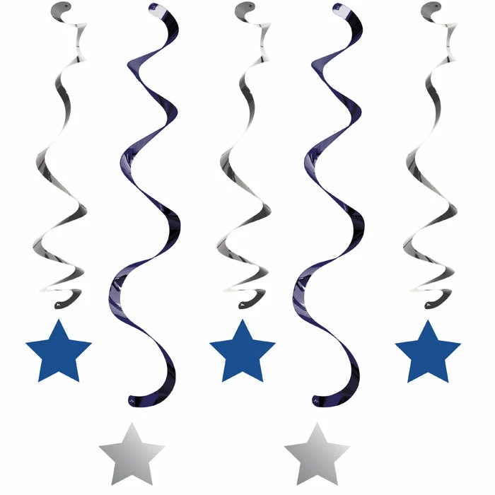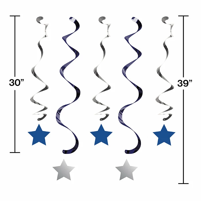 Details: Shoot for the stars with your party decorations at your little boy’s first birthday party with the One Little Star Boy Dizzy Danglers. The hanging decoration includes silver and blue foil spirals with star attachments hanging from the bottom. These dizzy danglers can be matched with other One Little Star Boy party supplies. With discount pricing, our One Little Star Boy Dizzy Danglers are perfect for event planners, caterers, and home hostesses alike. For this price, you get one package containing (5) One Little Star Boy Dizzy Danglers. Approximate Dimensions: 39 in