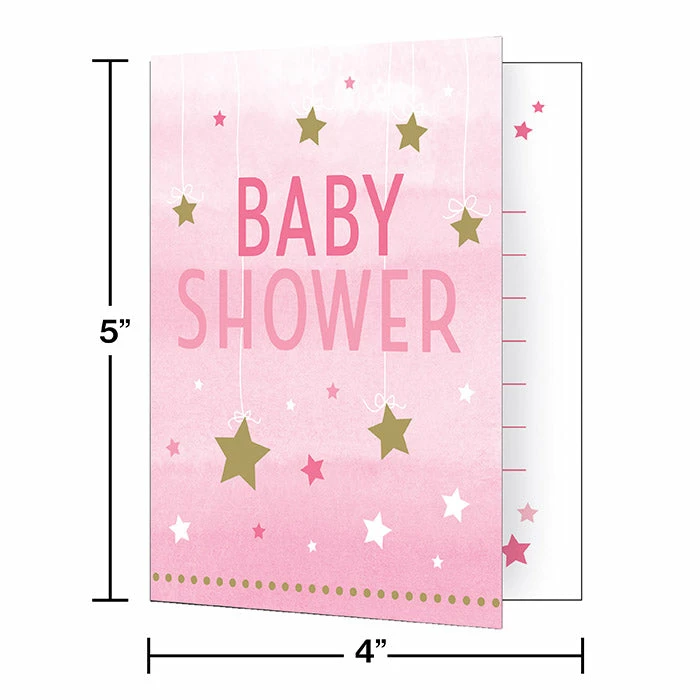Invite friends and family to the baby shower celebration with the One Little Star Girl Baby Shower Invitations. The 5″ x 4″ foldovers display a message reading “Baby Shower”? on the front with glistening stars in the background and provide plenty of room for party details on the inside. These invites come with envelopes for easy mailing. With wholesale pricing and bulk quantities, our One Little Star Girl Baby Shower Invitations 48 ct are perfect for event planners, caterers, and home hostesses alike.