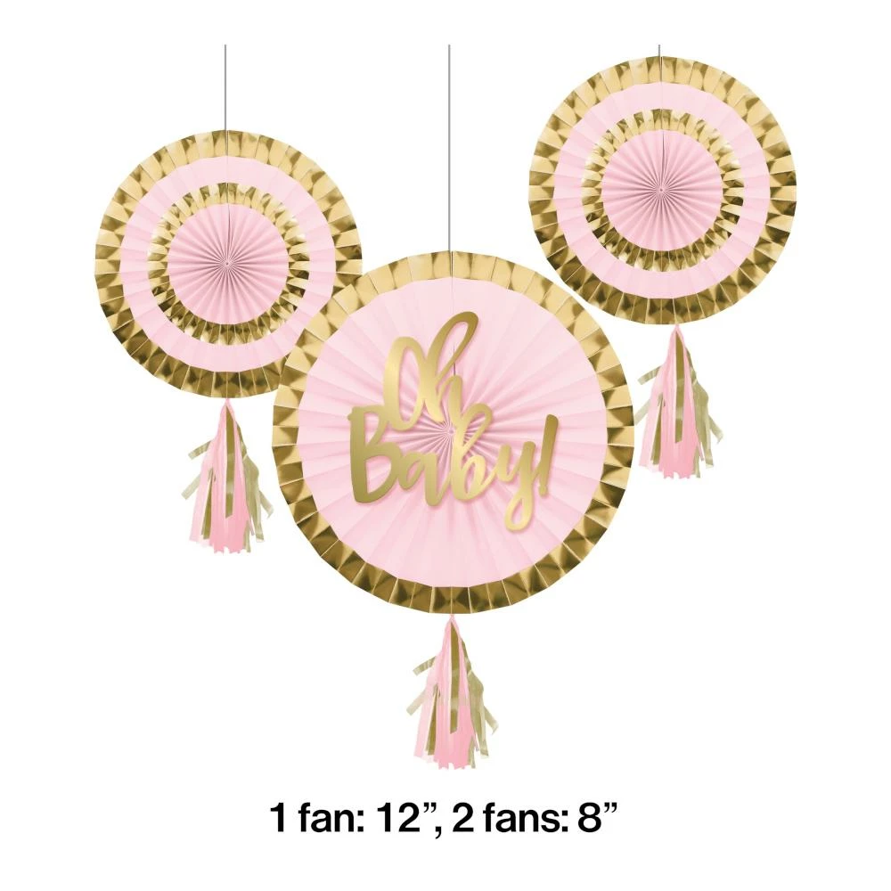 Details: Make your baby shower unforgettable with help from our Oh Baby Pink and Gold Foil Paper Fans with Tassels. This decoration creates a stylish party space with three included baby pink and metallic gold paper fans: one 12″ fan with “Oh Baby” lettering, and three 8″ accent fans. All of the fans feature baby pink and metallic gold tassels hanging from their bottoms. Group and hang the paper fans together near the gift or cake table to decorate your party in style. Complete the look with our coordinating baby girl baby shower supplies! Save more on party decorations, party favors and party supplies at PartyDecorations.com!. Material: Paper.