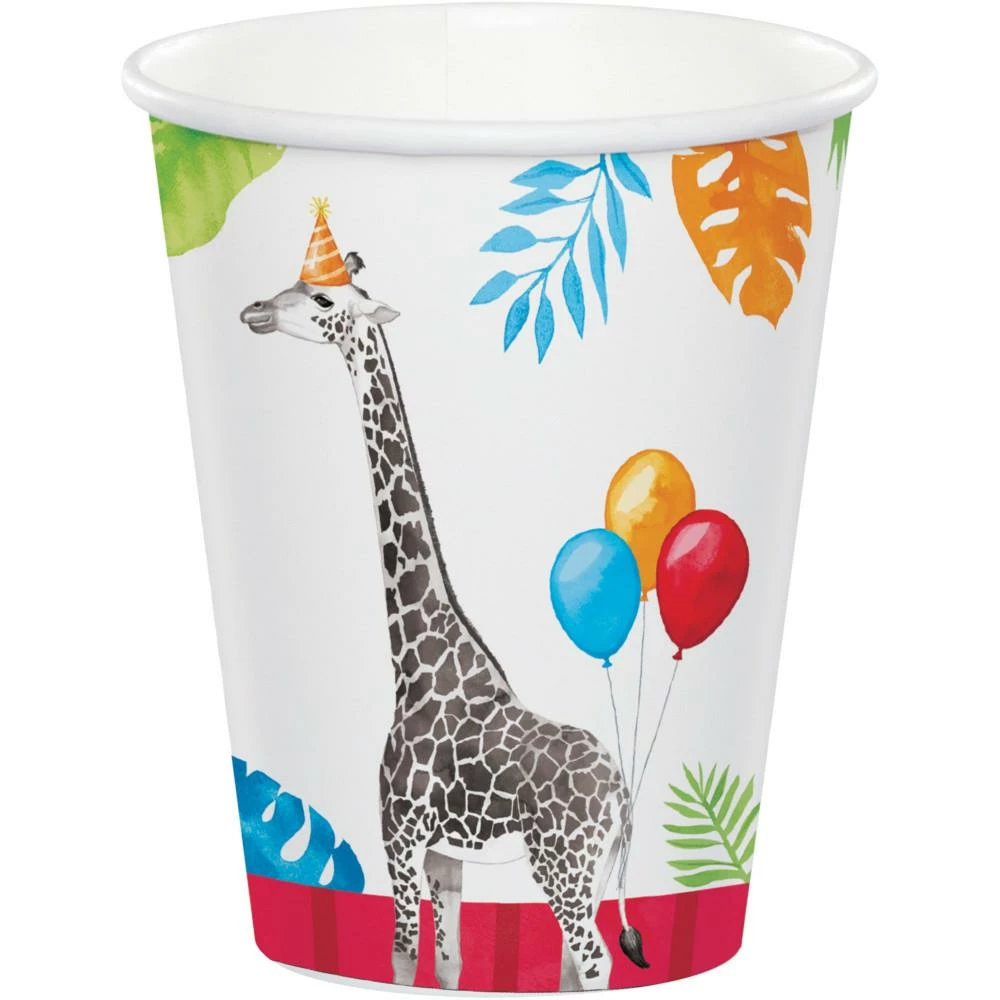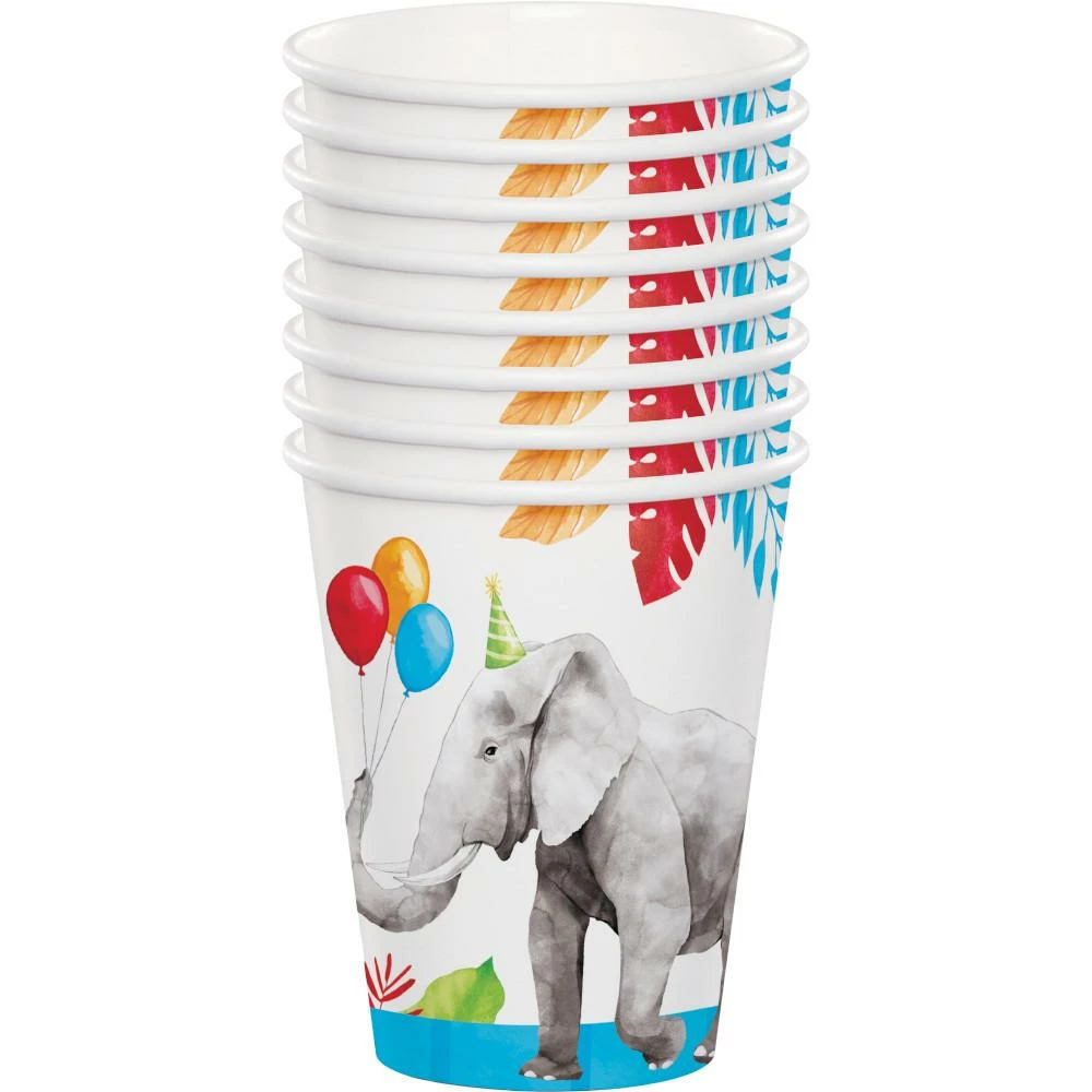 Details: Serve party punch, or your favorite beverage, with help from our Party Animals Paper Cups. These paper cups hold 9 ounces of beverage and can be used to serve hot or cold drinks. The paper cups feature elephants, monkeys, giraffes, and zebras with party accessories, plus red, green, orange, and blue jungle leaves. Our Party Animals Paper Cups are sold 8 cups per package and coordinate with our other Party Animals party supplies. Grab yours today and begin planning your wild celebration! Our Party Animals Paper Cups are perfect for event planners, caterers, and home hostesses alike.