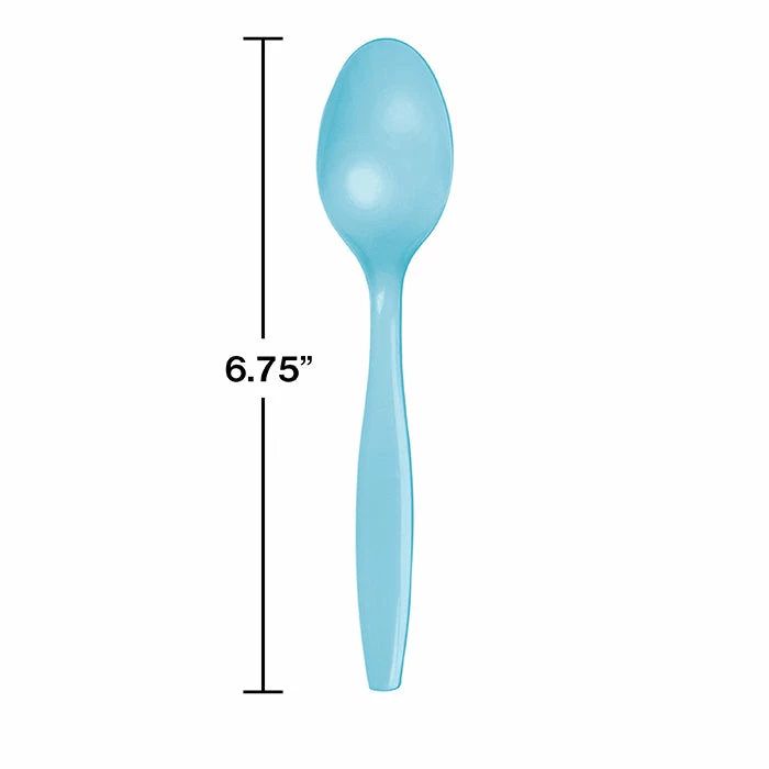 Details: Make any buffet or dining table extra enchanting with our wholesale Pastel Blue Plastic Spoons and other coordinating light blue cutlery. These blue wholesale plastic spoons are ideal for large celebrations, catered events and even take-out orders. Event planners and party hosts will appreciate how these heavy duty pastel blue spoons will last through an entire meal service without worry over breakage. Our Pastel Blue Plastic Spoons are sold with discount pricing at competitive wholesale cutlery prices. They coordinate beautifully with our entire set of light blue cutlery. For this price, you get one package containing (24) Pastel Blue Plastic Spoons. Approximate Dimensions: 6 in