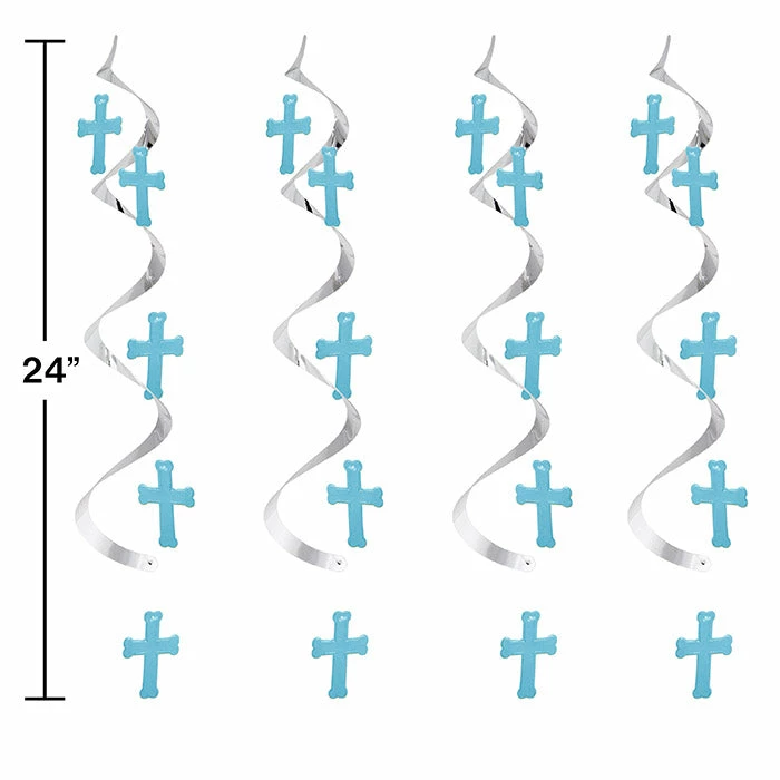 Hang some festive decor around the room at your religious celebration with these Blue & Silver Cross Dizzy Danglers. The hanging decorations measure 24″? long and feature silver foil strands with blue cross attachments. With wholesale pricing and bulk quantities, our Blue & Silver Cross Dizzy Danglers 30 ct are perfect for event planners, caterers, and home hostesses alike.