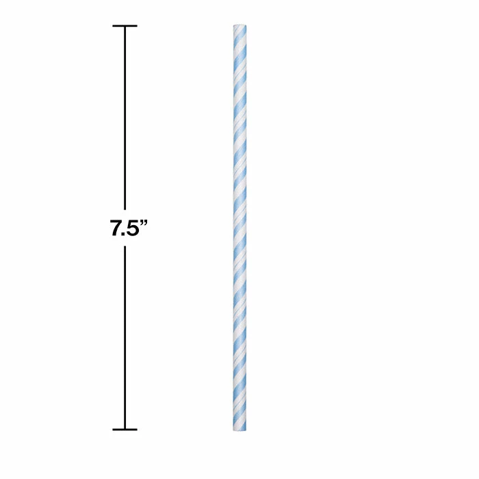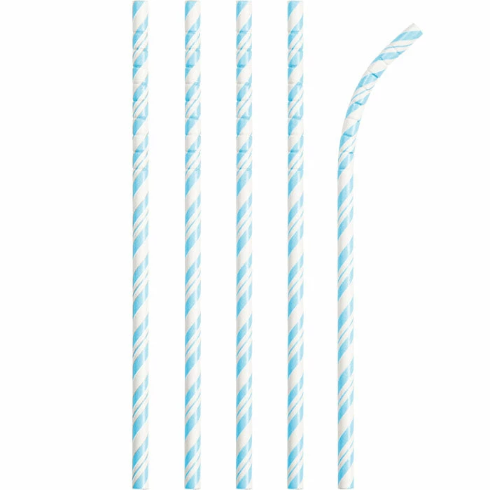 Details: Introduce fun colors and patterns to the celebration with the stylish Pastel Blue and White Striped Paper Straws. The decorative flexible drinking straws feature wide and narrow light blue diagonal stripes printed on sturdy paper that is biodegradable and compostable. The disposable straws are made in the USA from FDA accepted materials that use non-toxic food safe dyes. Each straw measures 7.75 inches long and are meant to be used by restaurants, event planners, zoos, theme parks, hospitals, hotels, airports and more. The drinking straws will coordinate with multiple events, add entertaining accents and are eco-friendly. Paper straws are sold in packages of 24. For this price, you get one package containing (24) Pastel Blue Striped Paper Straws. Approximate Dimensions: 7.75 in