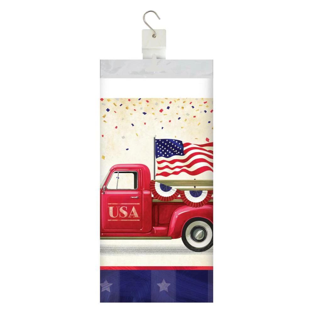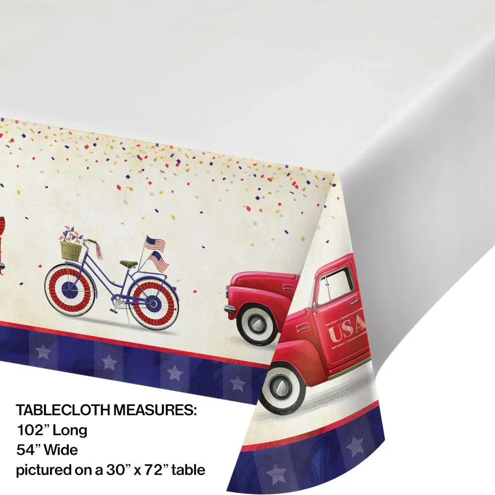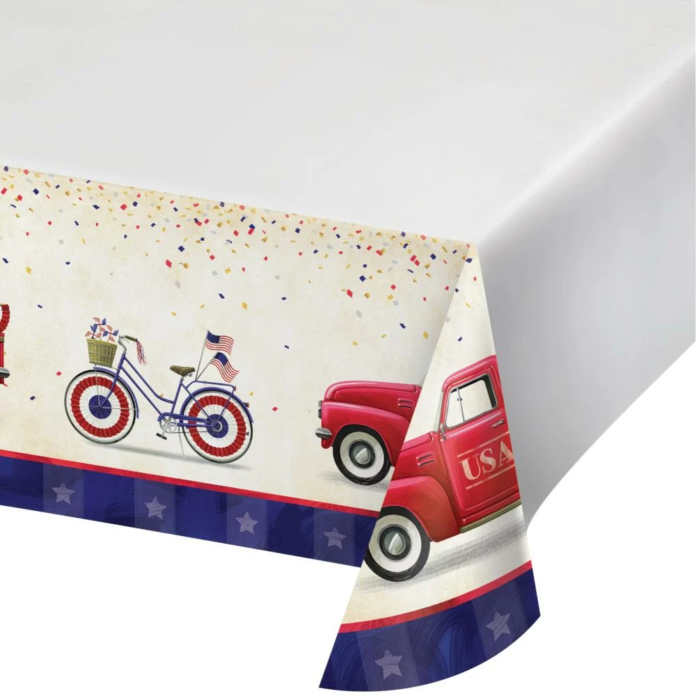 - The paper table cover features a patriotic vintage truck and bicycle parade design