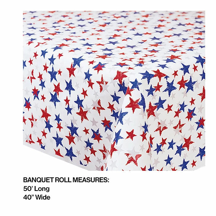 Details: Protect your table and make clean-up a breeze with the Red, White, and Blue Stars Banquet Roll. This plastic table roll measures 40″ x 50′ and is great for large gatherings and covering long tables. Sold in packages of 2, this product can be mixed and matched with other red, white, and blue party supplies. You get one Patriotic Banquet Roll, Rwb Stars 40″ X 50′ for this price. Approximate Dimensions: 50 ft x 40 in