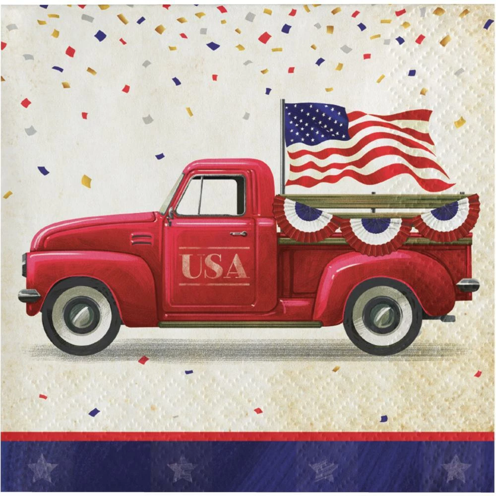 - The napkins feature a vintage truck Fourth of July design