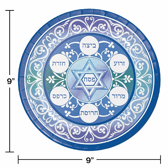 Details: Celebrate your Jewish heritage with the Pesach Dinner Plates! These 9″ paper plates are decorated with Judaic symbols plus delicate blue and gold flourishes. These beautiful paper plates are durable enough for your special Pesach feast. With discount pricing and great quality our Pesach Dinner Plates are perfect for event planners caterers and home hostesses alike. Approximate Size: 9″. Material: Heavyweight Paperboard