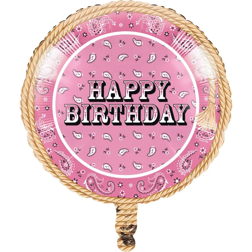 Create a great environment at your kid’s birthday party with this Pink Bandana Cowgirl Mylar Balloon. Measuring 18″, this party balloon is helium quality and features a Happy Birthday message in the center with a Western themed pink background and lasso border. The balloons coordinate with other Pink Bandana Cowgirl accessories and party supplies. With wholesale pricing and bulk quantities, our Pink Bandana Cowgirl Mylar Balloons 10 ct are perfect for event planners, caterers, and home hostessses alike.
