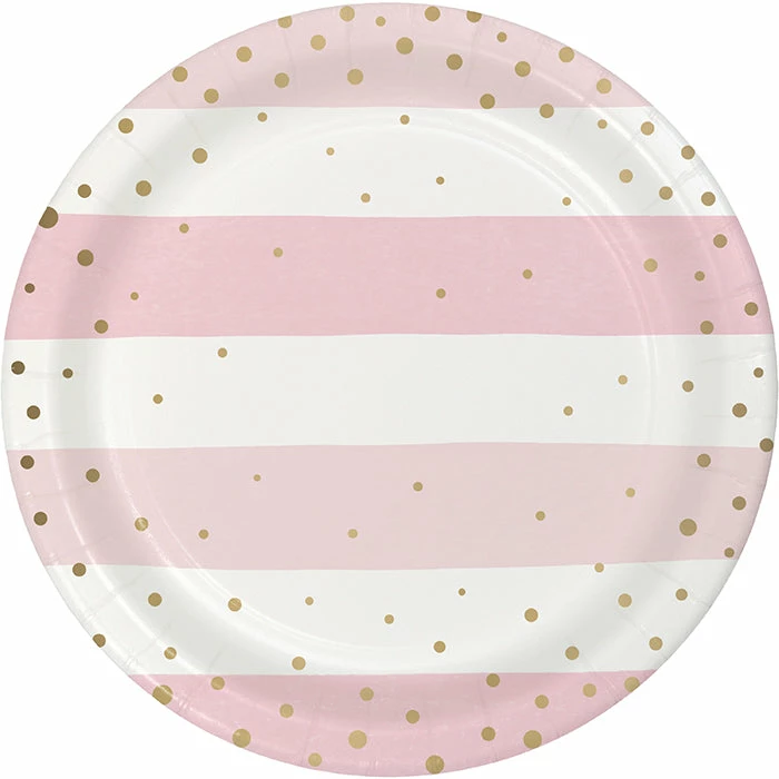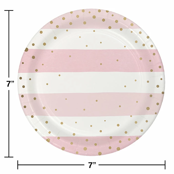 Details: That piece of chocolate cake will look magnificent served on the Pink and Gold Celebration Dessert Plates. These sturdy paper plates measure 7″ and feature a pink, white, and gold theme. These disposable paper plates coordinate with all Pink and Gold Celebration party supplies. Our Pink and Gold Celebration Dessert Plates are perfect for event planners, caterers, and home hostesses alike.
