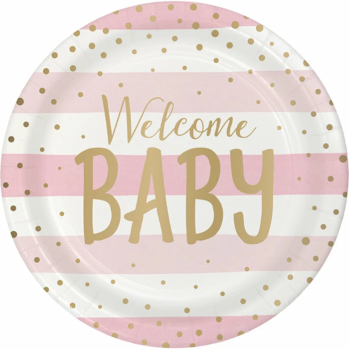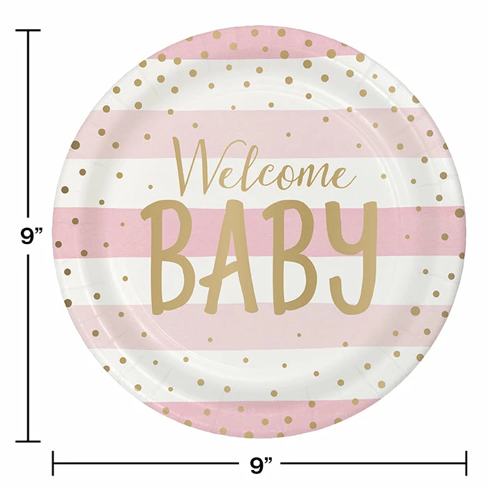 Details: Announce your litttle one’s arrival with the stylish Pink and Gold Celebration Baby Shower Paper Plates. These sturdy paper plates measure 9″ and feature the words “Welcome Baby” with a pink, white, and gold theme. These disposable paper plates coordinate with all Pink and Gold Celebration party supplies. Our Pink and Gold Celebration Baby Shower Dinner Plates are perfect for event planners, caterers, and home hostesses alike.