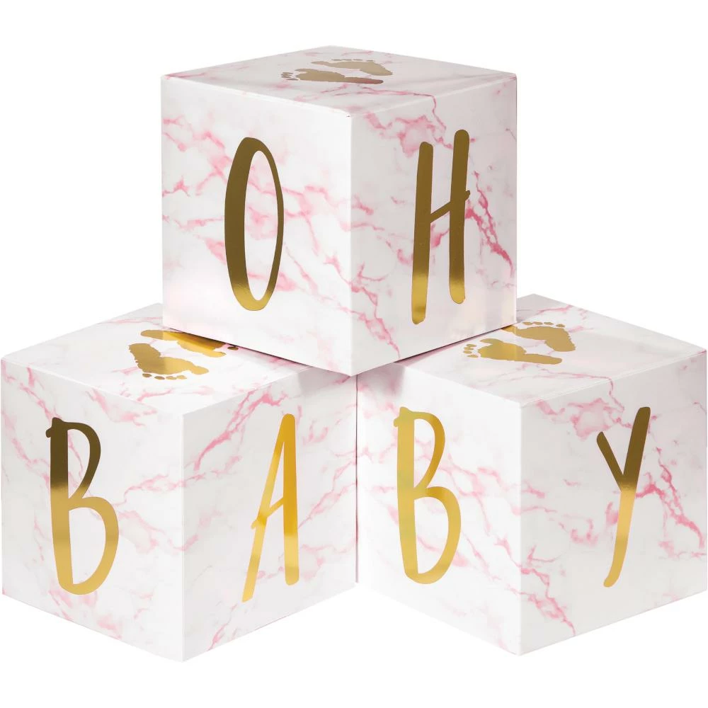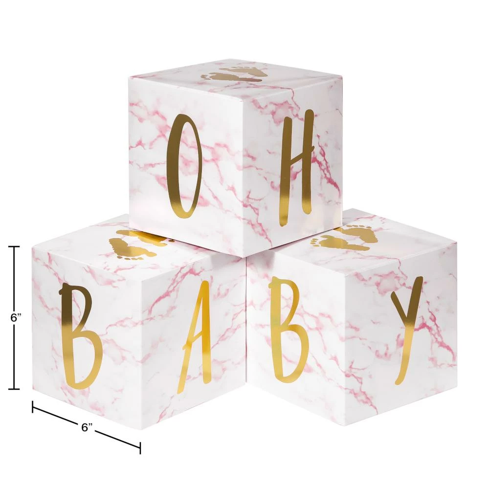 Details: The expecting mother will be overjoyed when she sees the adorable Pink Marble “Oh Baby” Centerpiece. These paper three-piece block centerpieces measure 6″ x 6″ and feature a pink marble design, and the words “Oh Baby!” with a pink, white, and gold theme. Sold in 3-piece packs of 1, these paper centerpieces coordinate with all Pink Marble party supplies. Save more on party decorations, party favors and party supplies at PartyDecorations.com!. Material: Paper. Approximate Size/Dimensions (inches): 6 x 6 x 6.