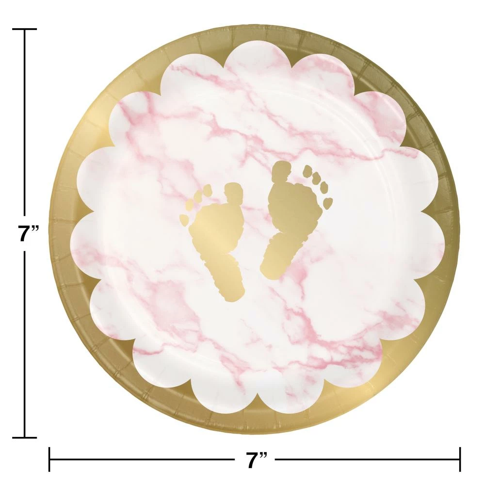 Details: Serve a wonderful treat to the expecting mother on the special heart-warming Pink Marble Baby Shower Footprints Dessert Plates. These sturdy paper plates measure 7″ and feature a pink marble design, gold baby footprints, and gold trim with a pink, white, and gold theme. Sold in packs of 8, these disposable paper plates coordinate with all Pink Marble party supplies. Save more on party decorations, party favors and party supplies at PartyDecorations.com!. Material: Paper Boardstock With Foil. Approximate Size/Dimensions (inches): 6.875 x 6.875.