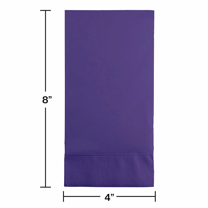 Details: Premium 3-ply Purple Guest Towels are ideal for use as a napkin or disposable hand towel at any number of special celebrations. Each measures 4.375 inches wide x 8 inches long, folded, and arrives ready to display alongside a festive table setting, buffet service, or even as a nice touch inside a guest washroom. The towels can be perfectly paired with patterned or complementary solid color tableware and decoration at any celebration. The Purple guest towel includes 16 per package. For this price, you get one package containing (16) Purple Guest Towel, 3 Ply. Approximate Dimensions: 8 in x 4.4 in