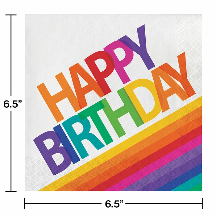 Details: Big, multicolored block letters spell out “Happy Birthday” on the vivid design on the wholesale Rainbow Birthday Luncheon Napkins. Cheery and festive, the disposable napkin looks stunning when combined with tableware from rainbow party supplies. Set stacks of the absorbent napkin at the dessert bar to use with servings of birthday cake or pass them out to guests to use with appetizers. For this price, you get one package containing (16) Rainbow Birthday Napkins. Approximate Dimensions: 6.4 in x 6.4 in