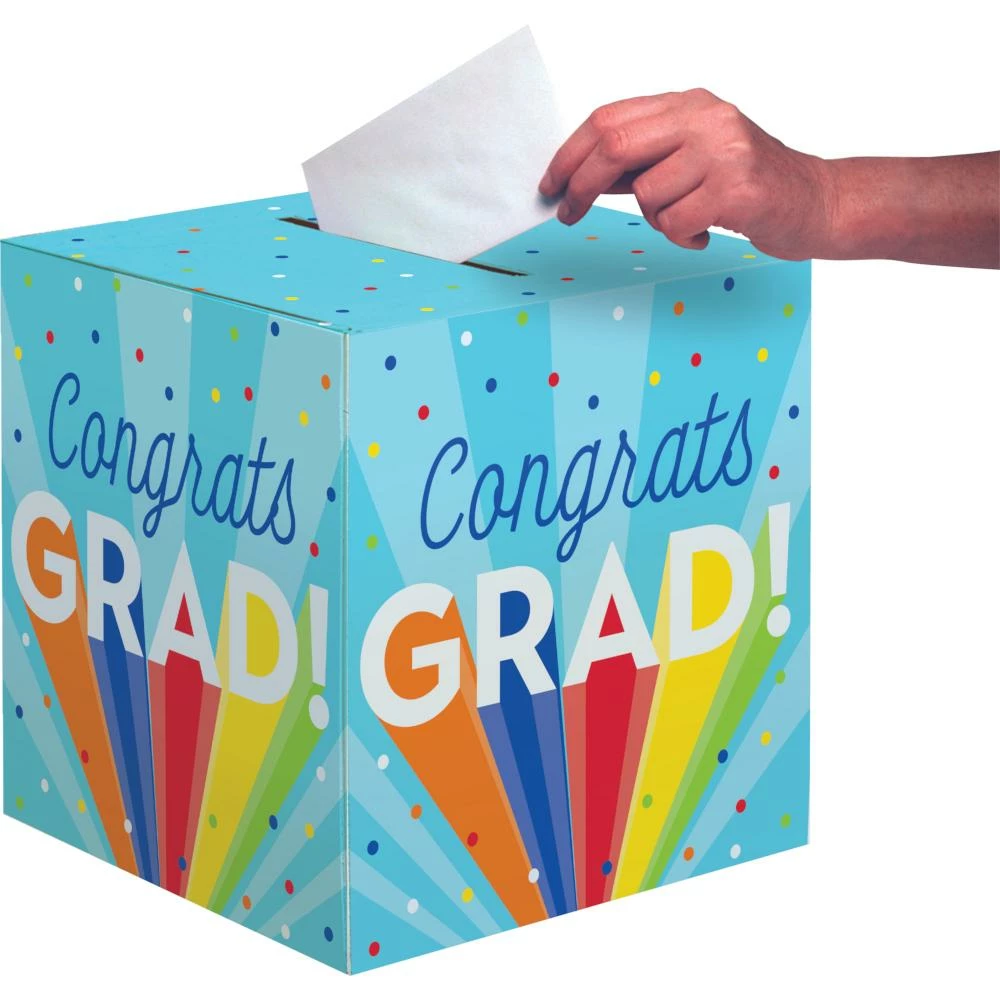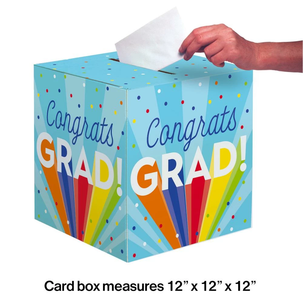 Details: Make it easy for your guests to wish you well when they put their cards in the Rainbow Grad Card Box. These paper card boxes measure 12″ x 12″ and feature confetti and the words “Congrats Grad” with a rainbow theme. Sold individually, these paper card boxes coordinate with all Rainbow Grad party supplies. Save more on party decorations, party favors and party supplies at PartyDecorations.com!. Material: Paper. Approximate Size/Dimensions (inches): 12 x 12 x 12.