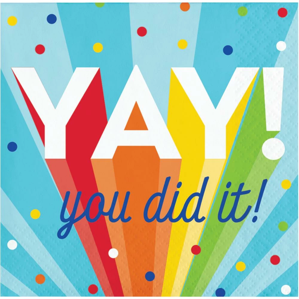 Details: Toast your graduate in style when you serve their favorite beverage on the Rainbow Grad Beverage Napkins. These 2-ply cocktail napkins measure 5″ and feature confetti and the words “YAY! You Did It!” with a rainbow theme. Sold in packs of 16, these disposable paper napkins coordinate with all Rainbow Grad party supplies. Save more on party decorations, party favors and party supplies at PartyDecorations.com!. Material: Tissue. Approximate Size/Dimensions (inches): 5 x 5.