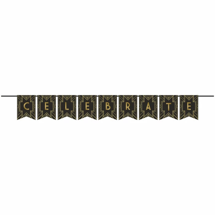 Details: Tie together your celebration with this Roaring 20s DIY Banner. Featuring an elegant black and gold design spelling out the phrase “Celebrate”, this banner is the perfect addition to your celebration. Measuring 69.5″ x 6″ and sold individually, this banner can be paired with any other Roaring 20s party supplies. Save more on party decorations, party favors and party supplies at PartyDecorations.com!. Material: Paper/Foil/Polyester. Approximate Size/Dimensions (inches): 6 x 69.5.