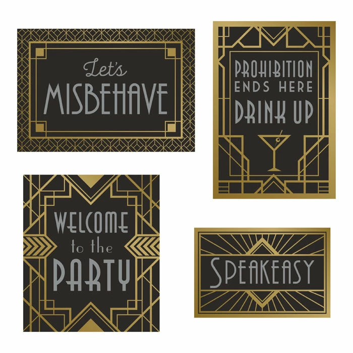 Details: Make decorating easy with these Roaring 20s Wall Signs Decorations Kit. Featuring different 20s themed signs with phrases such as “Welcome to the Party” and “Speakeasy”, these signs are the perfect way to set the theme of your celebration. Measuring 10″ x 6.5″, 10″ x 11.5″, and 13″ x 9″, these signs can be paired with any other Roaring 20s party supplies. Our Roaring 20s Wall Signs Decorations Kit 30 ct are perfect for event planners, caterers, and home hostesses alike.
