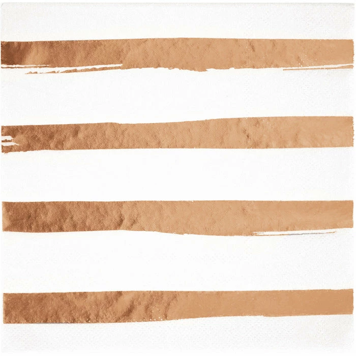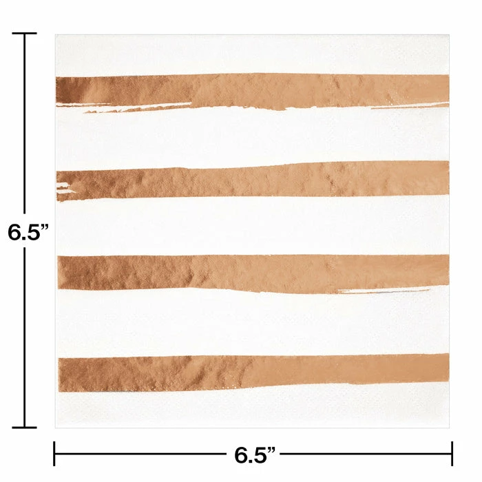Details: Add some elegance to your celebration with these Rose Gold Foil Napkins. Featuring a fun rose gold striped design, these napkins are the perfect addition to your party tables. Measuring 6.5″ these napkins can be paired with any other Rose Gold Foil party supplies. Our Rose Gold Foil Luncheon Napkins are perfect for event planners, caterers, and home hostesses alike.