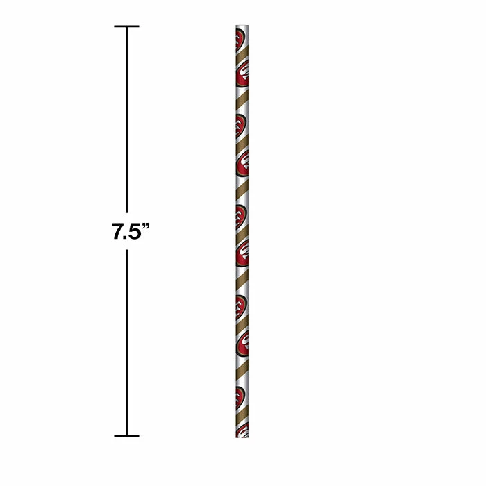 Details: Football fans will be sipping pretty with stylish licensed NFL party supplies. The San Francisco 49ers Straws are made from biodegradable 100% chlorine free paper and printed with food safe dyes. A metallic gold stripe winds around the spiral surface next to pictures of the 49ers team logo – a red oval with “SF” stamped in white and bordered by gold and black. Offer the disposable straws to use with beverages served in the 49ers plastic cups at concession stands drink kiosks bars restaurants and souvenir shops. These fun accessories are easy to mix with coordinating solid colored tableware for spirited team support. The straws measure 7.75 inches in length and are sold 24 per package. Approximate Size: 7.75″. Material: Biodegradable 100% Chlorine Free Paper