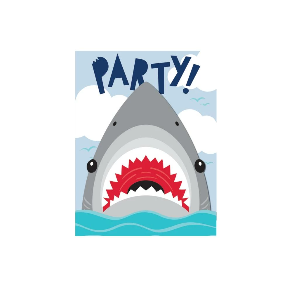 Details: Invite your guests to swim over for a shark-themed party with our Shark Party Invitations. These party invitations measure 4.5″ x 6″ and include envelopes. The invitations feature a tri-fold design with a toothy shark emerging from the ocean. Simply write your party details inside. Sold 8 invitations per package, grab yours today! Save more on party decorations, party favors and party supplies at PartyDecorations.com!. Material: Paper. Approximate Size/Dimensions (inches): 6 x 4.5.