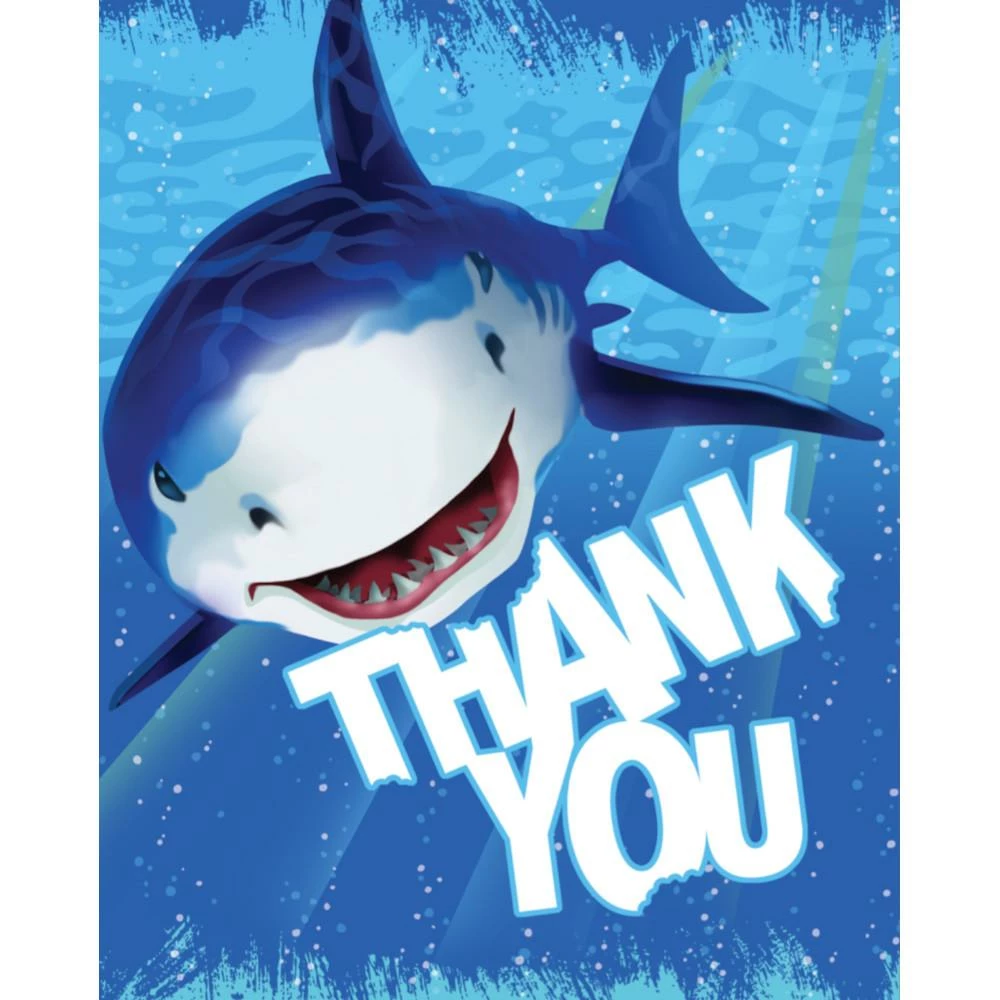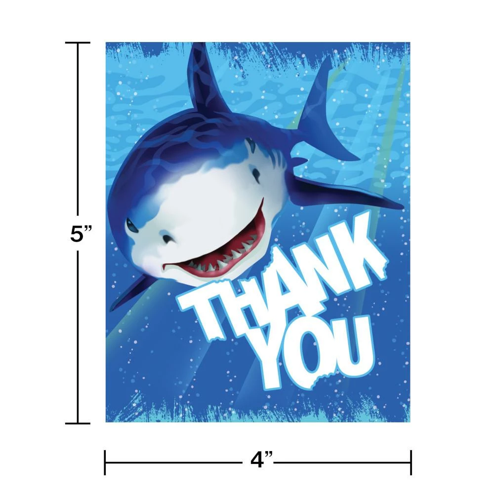 Thank your little shark lovers for coming to the party with the Shark Splash Thank You Notes. These notes measure 4″ x 5″ and feature a smiling shark underwater and the phrase “Thank You” with bites taken out of several letters. These notes can be combined with any of our other Shark Splash party supplies. With wholesale pricing and bulk quantities, our Shark Splash Thank You Notes 48 ct are perfect for event planners, caterers, and home hostesses alike.
