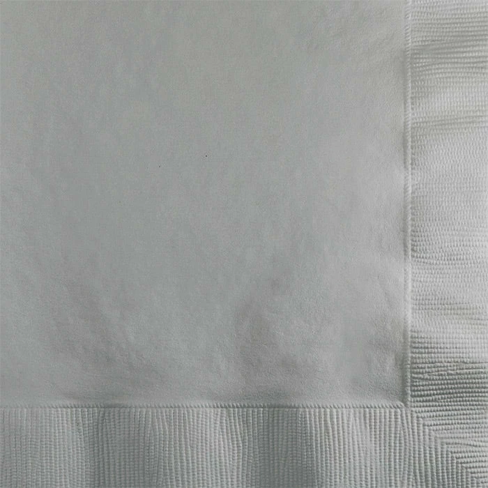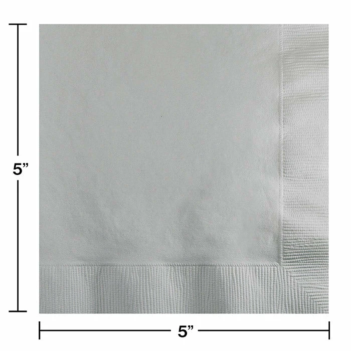 Details: Event planners, caterers, and budget friendly brides will love these Shimmering Silver Beverage Napkins as an economical yet eye catching alternative to pricier cloth napkins. The shimmering silver napkins will add a touch of glitz to any special event and are perfectly sized for cocktails, appetizers, and desserts. Use alongside party supplies in complementary patterns or with other tableware and decorations from the Shimmering Silver line. Premium 2-ply drink napkins measures 4.938 inches x 4.938 inches, while folded, and are packaged 50 each. For this price, you get one package containing (50) Shimmering Silver Beverage Napkin 2Ply. Approximate Dimensions: 5 in x 5 in