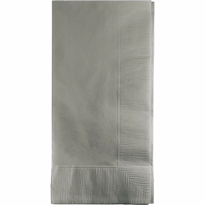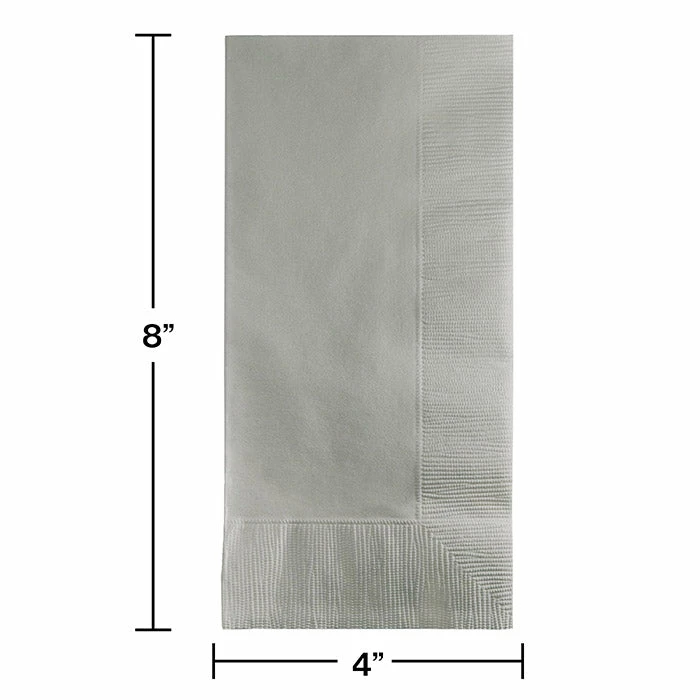 Details: Simple work for a caterer, event planner, or budget friendly hostess the Shimmering Silver Napkins provide and elegant feel without the hassle of cloth. Napkins are structured with a 1/8th fold design so look impressive as part of a table setting or buffet display. The dinner napkins measure 4″ x 8″ and are an ideal size for lunch or dinner service. The 2-ply napkins can be used in combination with other shimmering silver tableware or as an accent to patterned supplies that include a hint of silver. Shimmering silver napkins arrive 50 napkins per package. For this price, you get one package containing (50) Shimmering Silver Dinner Napkins 2Ply 1/8 Fold. Approximate Dimensions: 8 in x 4 in