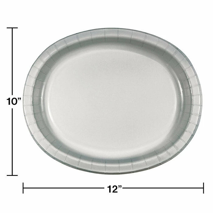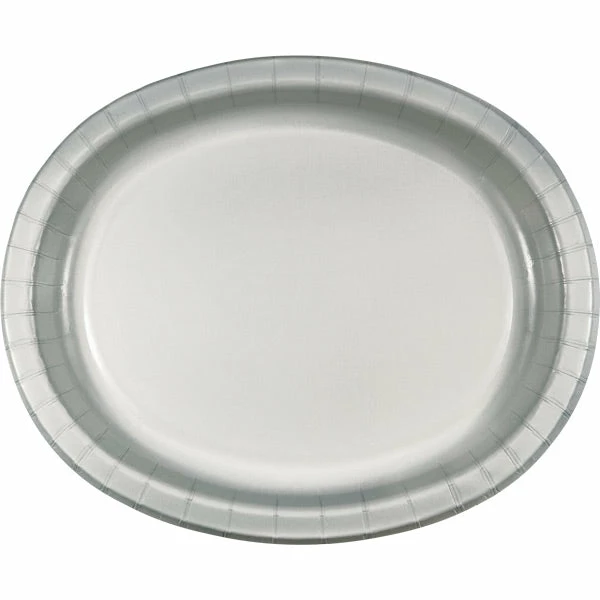 Details: These elegant Shimmering Silver Oval Platters will make the perfect anchor to any table setting or accommodate large amounts of food at buffet lines. The classy hue matches the rest of the tableware items in the shimmering silver Touch of Color collection. Each oval shaped platter measures 10 inches x 12 inches and is constructed of premium strength paper for durability. Packaged 8 each. For this price, you get one package containing (8) Shimmering Silver Oval Platter 10″ X 12″. Approximate Dimensions: 12 in x 10 in