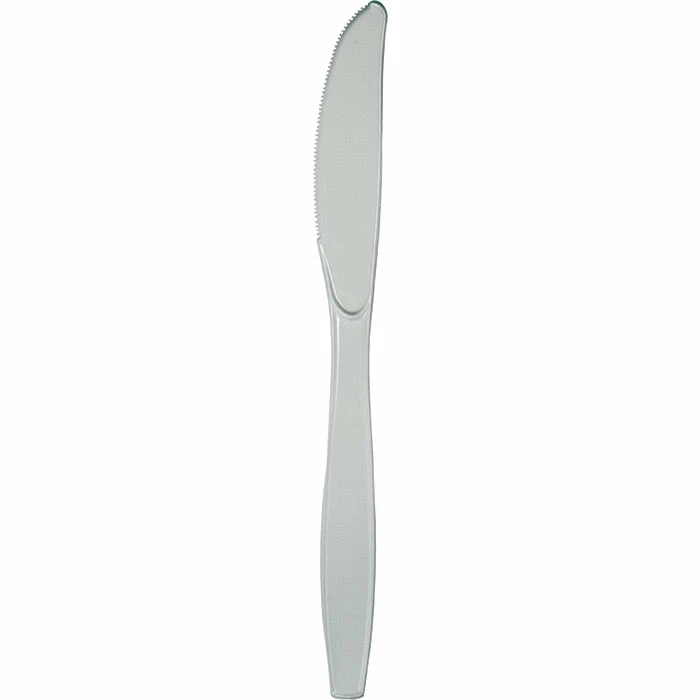 Details: Hostesses on a budget can control exactly what utensils are needed using our discount packages of knives, forks, and spoons. The Shimmering Silver Plastic Knives are ideal along patterned party supplies for 25th wedding anniversaries, milestone birthdays, holiday parties and more. The heavy duty plastic knives are able to stand up to standard party fare while still enhancing the look of the table decoration. As an added bonus they can simply be disposed of or recycled at the end of the event. Shimmering Silver discount Plastic Knives consist of 50 knives per package. For this price, you get one package containing (50) Shimmering Silver Plastic Knives. Approximate Dimensions: 7.5 in