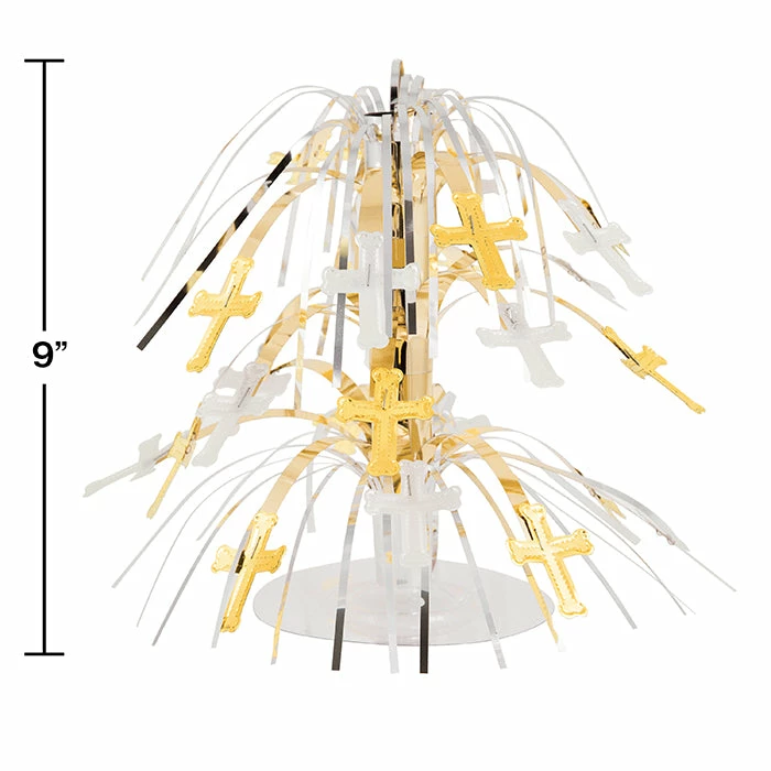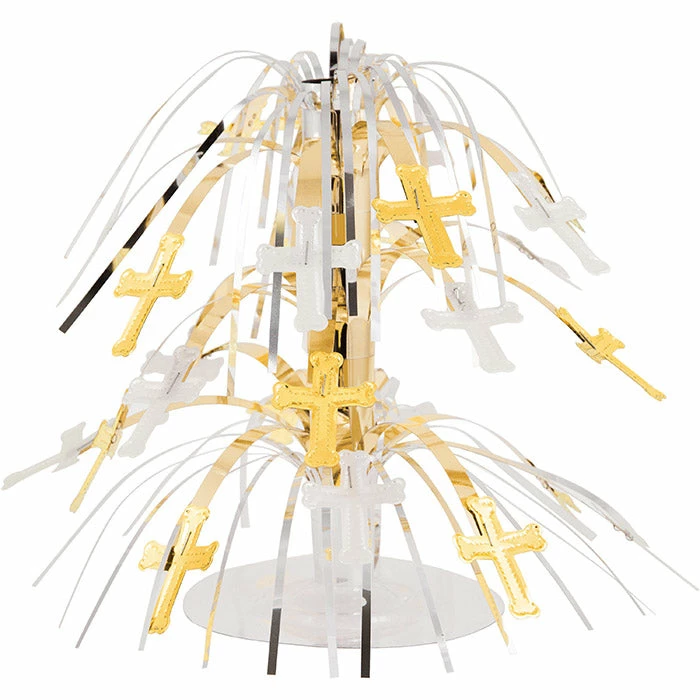 Place the Gold & Silver Cross Centerpiece in the middle of your table at the big get-together. The foil cascade centerpiece measures 8.5″? tall and includes silver strands shooting out with attachments of gold crosses. The table decoration is perfect for your religious celebration. With wholesale pricing and bulk quantities, our Gold & Silver Cross Centerpiece 12 ct are perfect for event planners, caterers, and home hostesses alike.