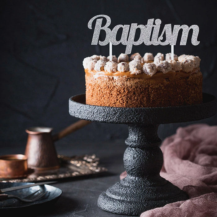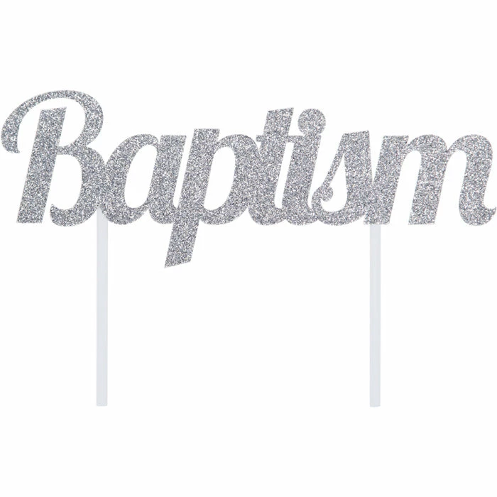 Top your cake with this beautiful Baptism Glitter Cake Topper. Featuring the phrase “Baptism” spelled out in silver glitter letters, this is the perfect touch to any cake. Measuring 5.5″ x 7″, this cake topper pairs well with any other religious party supplies. With Wholesale pricing and bulk quantities, our Baptism Glitter Cake Toppers 12 ct are perfect for event planners, caterers, and home hostesses alike.