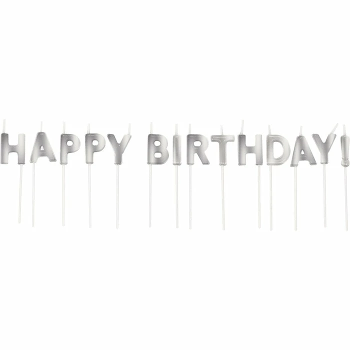 Details: Make your cake the center of attention with these Silver Happy Birthday Candles. Featuring the phrase “Happy Birthday” spelled out in an elegant silver design these candles are the perfect thing to bring excitement to your cake. Measuring .5″ x 2.5″ these candles can be paired with any other party supplies. With discount pricing and great quality our Silver Happy Birthday Candles are perfect for event planners caterers and home hostesses alike. Approximate Size: 0.5″ x 2.5″. Material: Wax
