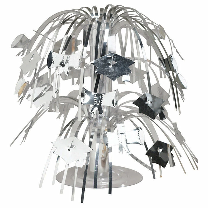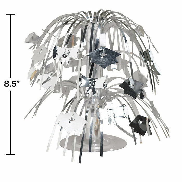 Details: Liven up the celebration with a flashy Silver Grad Mini Cascade Centerpiece in the middle of the table. Sprays of silver foil extend up and outward from a sturdy plastic base while small silver mortarboard cutouts adorn the strips for a festive statement. Sold in packs of 12, the centerpiece stands 8.5 inches tall when assembled and it is fun to combine with other spray centerpieces in your graduate’s school colors. You get one Silver Mortarboard Graduation Centerpiece for this price. Approximate Dimensions: 9 in x 9 in x 9 in