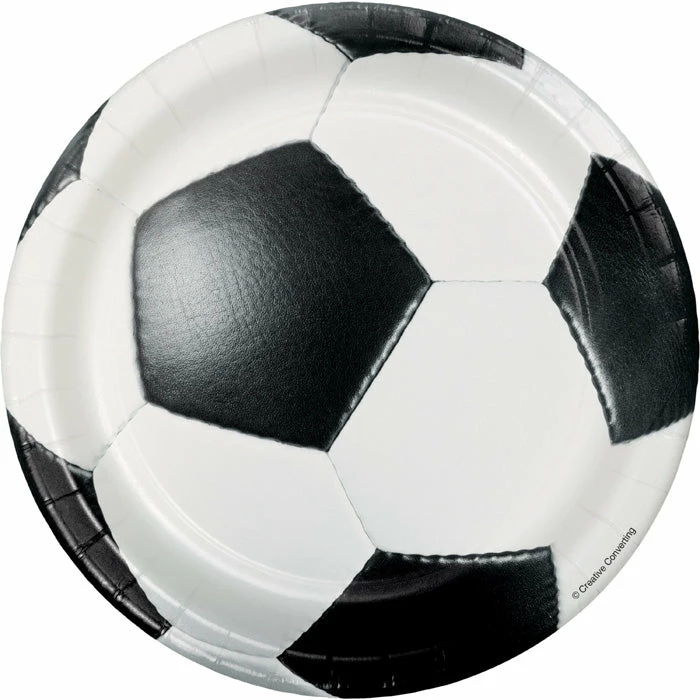 Details: Score the winning goal with these Soccer Dessert Plates. The Sturdy Style paper plates measure 7″ round and feature a picture of a soccer ball, covering the entire plate. The premium strength paper plate can be combined with other Soccer party supplies. With discount pricing, our Soccer Dessert Plates are perfect for event planners, caterers, and home hostesses alike. For this price, you get one package containing (8) Soccer Dessert Plates. Approximate Dimensions: 6.875 in x 6.875 in