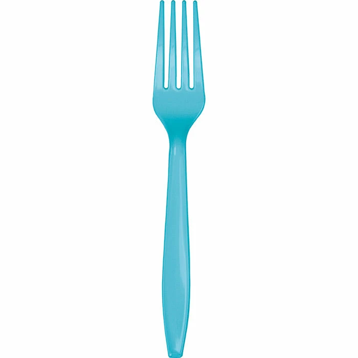 Details: The Bermuda Blue discount Plastic Forks from our Touch of Color collection are an economical and stylish substitution for the real thing. Constructed from premium plastic in a solid Bermuda Blue shade that coordinates with all the Bermuda Blue party supplies, the discount package of sturdy plastic forks is perfectly suited for use at weddings, corporate functions, family gatherings or any special occasion that will have a large crowd in attendance. The Bermuda Blue discount Plastic Forks retail 50 pieces per package. For this price, you get one package containing (50) Bermuda Blue Plastic Forks. Approximate Dimensions: 7 in