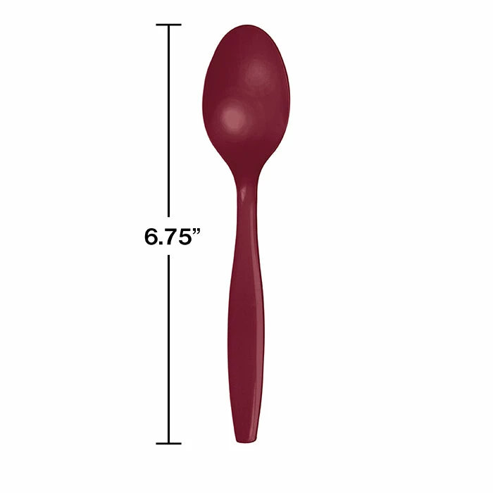 Details: Make your next catered event, social gathering, or any other large celebration a big success with our wholesale Burgundy Plastic Spoons. These vibrant burgundy spoons will add a beautiful touch of color to any buffet or table setting. In addition to their beautiful design, guests and patrons alike will appreciate the exceptional quality of these disposable spoons. Our plastic silverware is constructed from premium plastic, so it will last through an entire meal service without worry over breakage. Use our burgundy red spoons with our entire set of burgundy cutlery, or mix our burgundy plastic cutlery with utensils in other shades for an extra vibrant look. For this price, you get one package containing (24) Burgundy Red Plastic Spoons. Approximate Dimensions: 6 in