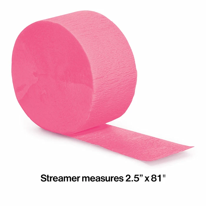 Details: The Candy Pink Crepe Streamer provides a sweet bubblegum accent to any party celebration venue. The pretty Candy Pink shade is color matched to coordinate with the entire line of Candy Pink party supplies for a uniform look. Crepe streamers are an economical choice for decorating weddings, showers and family functions that require a quick and easy party accent. The Candy Pink Crepe Streamer comes packaged individually in 1.75-inch x 81-foot rolls that retail 1 roll per package. You get one Candy Pink Crepe Streamers 81′ for this price. Approximate Dimensions: 81 ft x 1.75 in
