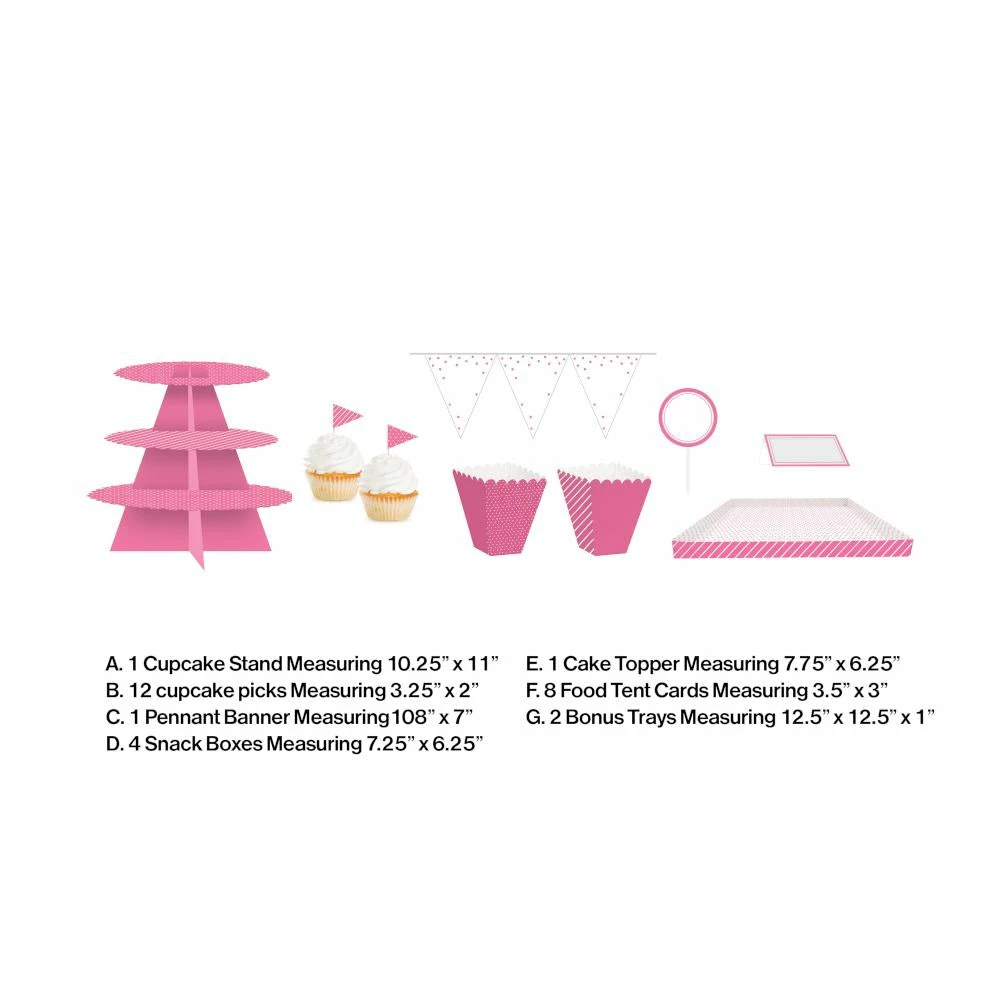 Details: Display your amazing desserts with this Candy Pink Treat Table Kit. Featuring a playful pink color, this treat kit is the perfect addition to your celebration. Each kit includes a cupcake stand (10.25″ x 11″), 12 cupcake picks (3.25″ x 2″), a pennant banner (108″) with 7″x 6″ pennants, 4 snack boxes (7.25″ x 6.25″), 8 tent cards, and a cake topper (7.75″ x 5″). This kit can be paired with any other party supplies. Save more on party decorations, party favors and party supplies at PartyDecorations.com!.