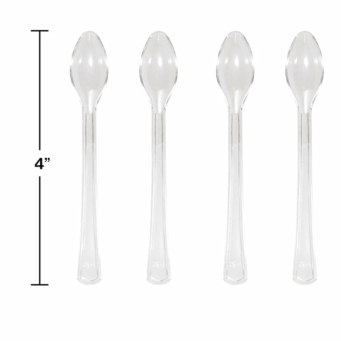 Details: Set a trend in your entertaining business when you complement appetizer, dessert tables and more with the perfectly petite sized spoon for your mini treats and tasting samples! The BPA free sturdy plastic Clear Mini Spoons from TrendWare measure just 4.125 inches long which makes them a perfect size for smaller portioned items as well as one time sampling and tasting of foods at deli counters, ice cream parlors and more! Stock up with this crystal clear hot new party accessory that literally coordinates with any color palette for a new look that will set the trend in up-to-date entertaining! Translucent Clear Mini Spoons are sold 24 pieces per package. For this price, you get one package containing (24) Clear Mini Appetizer Spoons. Approximate Dimensions: 4 in