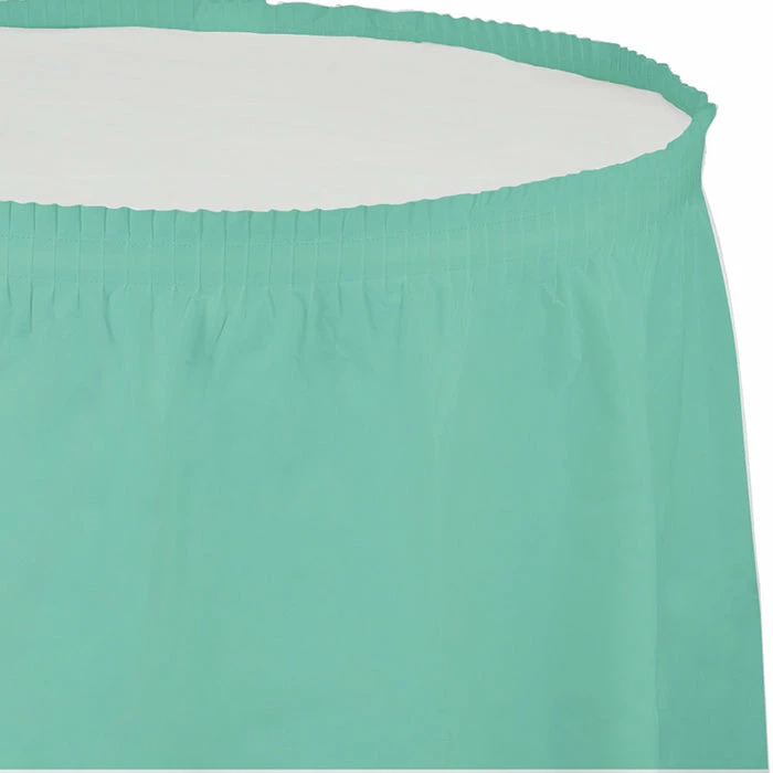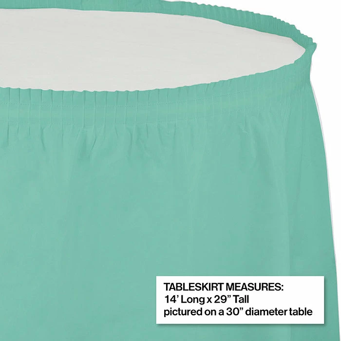Details: This Fresh Mint Green Plastic Tableskirt will provide an eye-catching setting at your upcoming event. Use these tasteful tableskirts to dress up your table. This beautiful table decoration can be ready in no time at all and is perfect for graduations, banquets, and weddings. With discount pricing, our Fresh Mint Green Plastic Tableskirt are perfect for event planners, caterers, and home hostesses alike. You get one Fresh Mint Plastic Tableskirt, 14′ X 29″ for this price. Approximate Dimensions: 168 in x 29 in